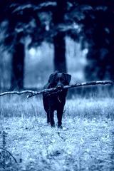 Beautiful black dog runs through the autumn forest with a stick