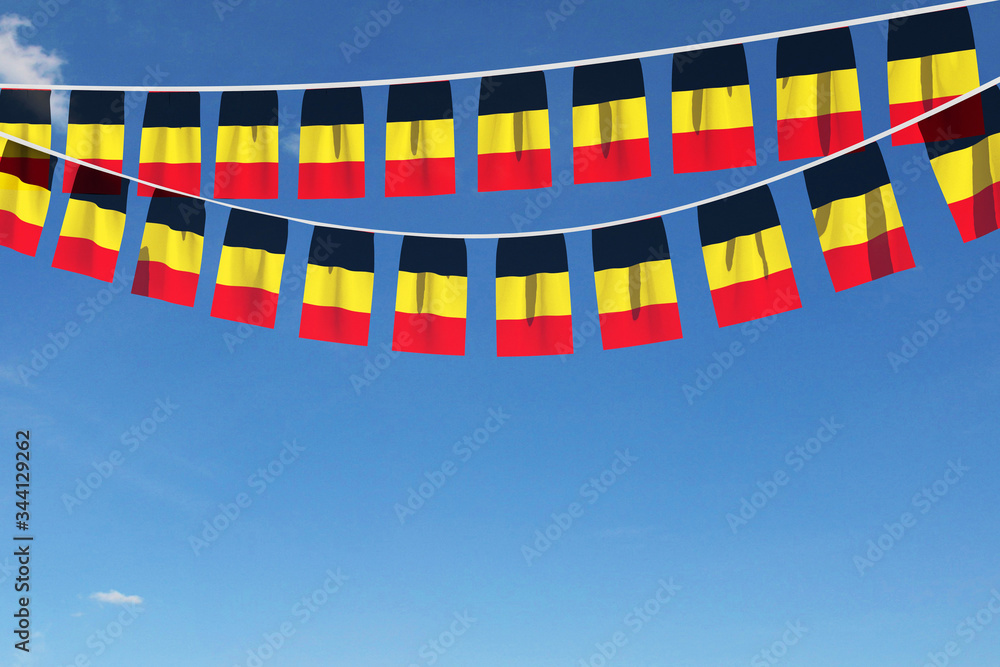 Belgium flag festive bunting hanging against a blue sky. 3D Render