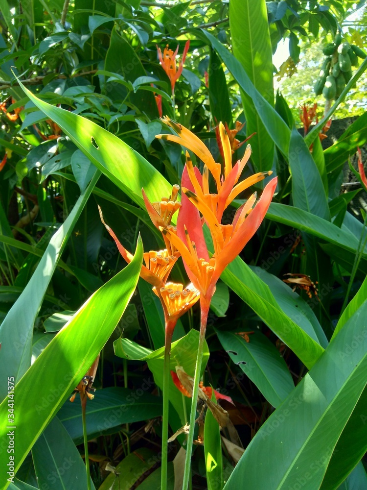 Close up Heliconia (Heliconiaceae, lobster-claws, toucan beak, wild plantains, false bird of paradise) with natural background