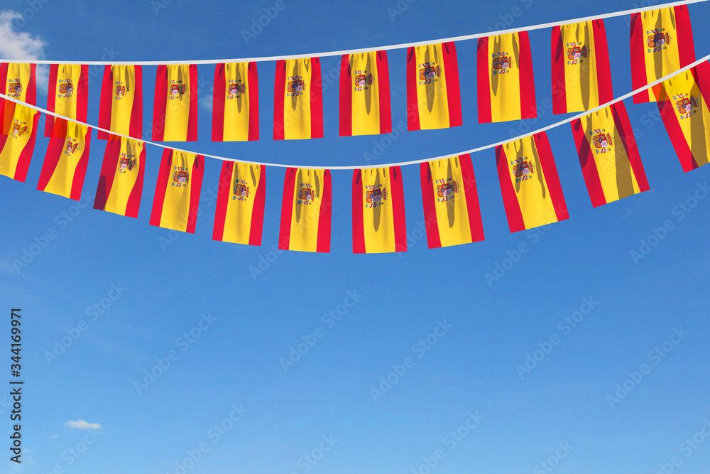 Spain flag festive bunting hanging against a blue sky. 3D Render