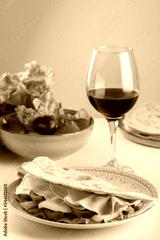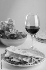 Happy hour - italian aperitif: glass of italian red wine with Italian flatbread - Piadina (Piada or piadina romagnola) with mozzarella cheese, salad, tomatoes and italian ham - prosciutto.