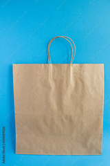 Empty paper bag for shoopping or delivery of goods on the blue background. Location vertical. Copy space.