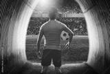 Football player with ball in hand at the entrance to the stadium.