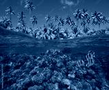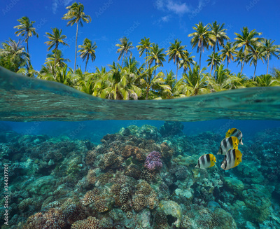 Coral reef with tropical fish underwater and green foliage of coconut palm trees, split view over and under water surface, French Polynesia, Pacific ocean, Oceania