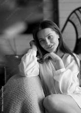 Beautiful woman in a dress sitting in the wicker chair at home