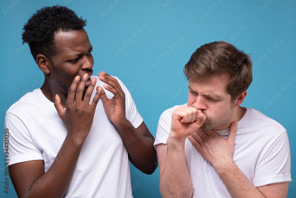 man is coughing because of flu or covid. Problem with lungs. Another is shocked that his friend is ill