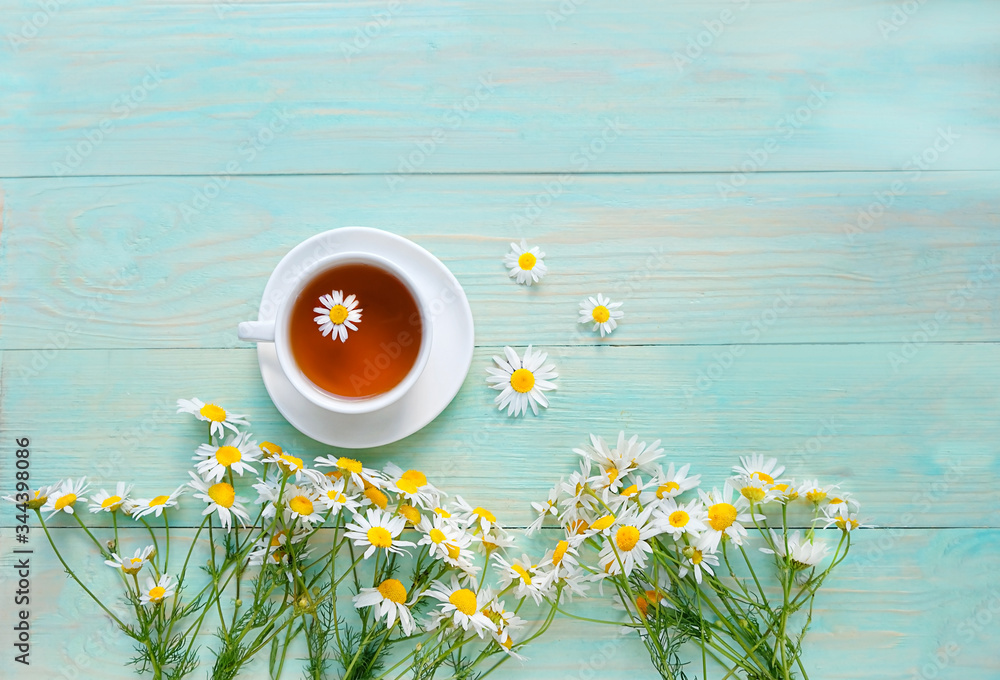chamomile flowers and cup of tea on wooden table. summer teatime, romantic breakfast. copy space