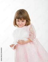 four-year girl in a beautiful pink dress with a fan.