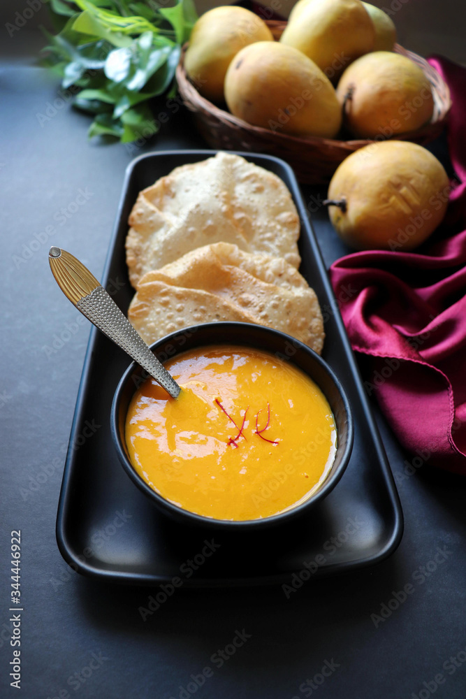 Indian Food - Aamras is a sweet dish made from the pulp of the Alphonso mango fruit. Served with hot puri/poori. Sweet Mango puree garnished with Kashmiri Saffron. with whole mangoes in background.