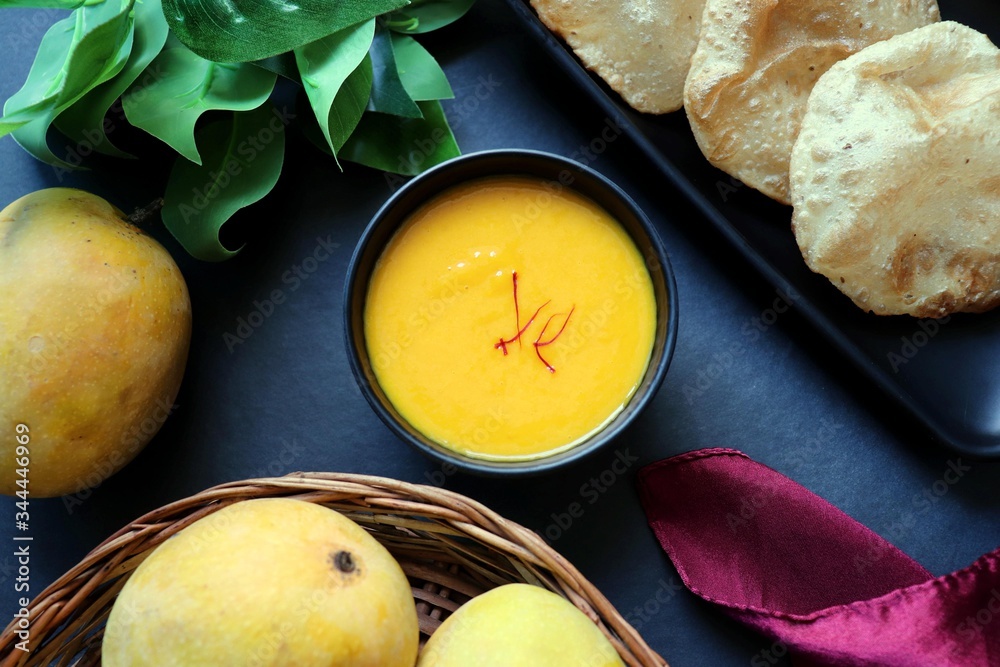 Indian Food - Aamras is a sweet dish made from the pulp of the Alphonso mango fruit. Served with hot puri/poori. Sweet Mango puree garnished with Kashmiri Saffron. with whole mangoes in background.