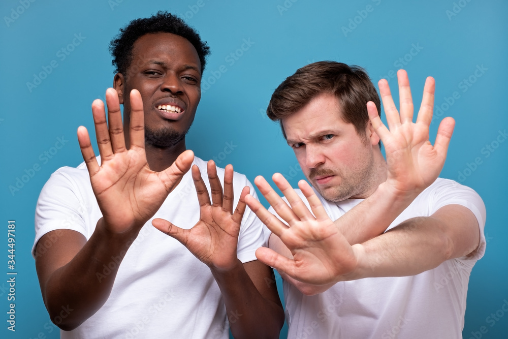 Two men african american and caucasian making stop sign making a social distance gesture.