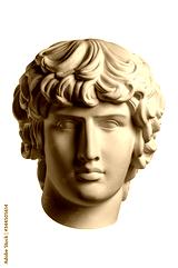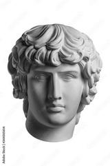 Gypsum copy of famous ancient statue Antinous head isolated on a white background. Plaster antique sculpture young man face. Renaissance epoch. Portrait.