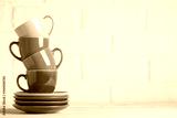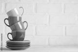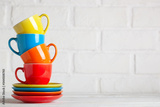 Colorful cups on the white background of a brick wall. Background with copy space. Horizontal. Selective focus.