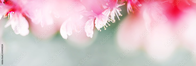 Spring abstract background of Blossoming pink almond flowers. Soft focus, shallow DOF. Wide spring web banner.
