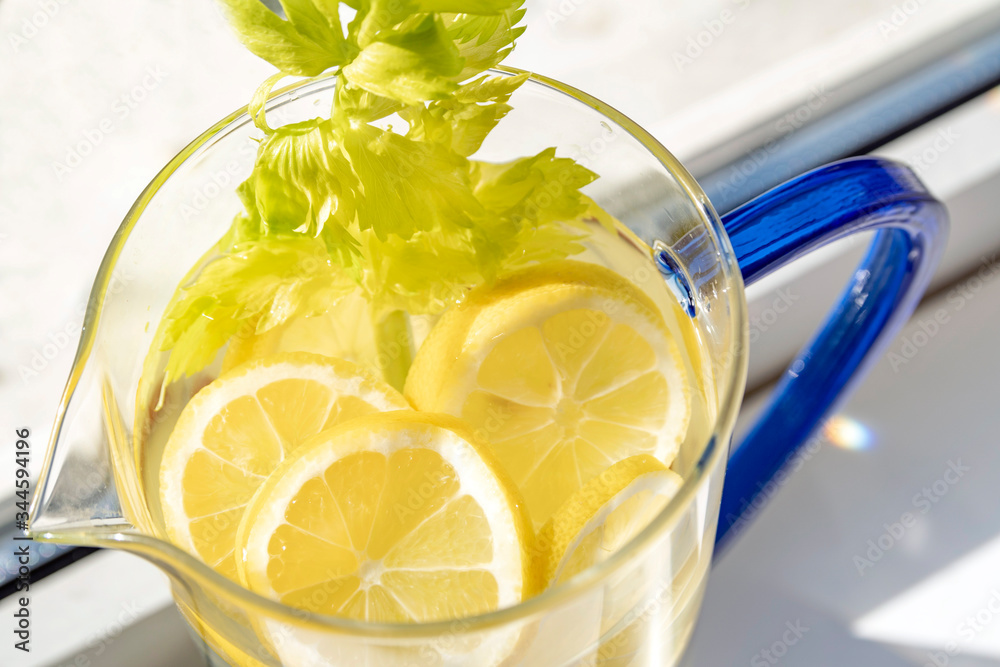 Lush green-yellow lemon slices and celery leaves in a blue handle glass carafe next to window at sunlight with high PH level detox water to boost the immune system to fight corona virus.