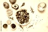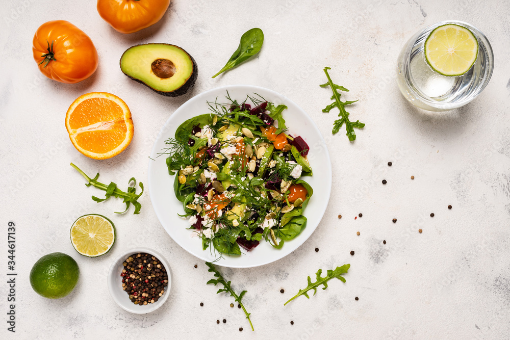Salad in a white bowl and different fresh vegetables on a white background. Concept of healthy diet food for weight loss. Top view.