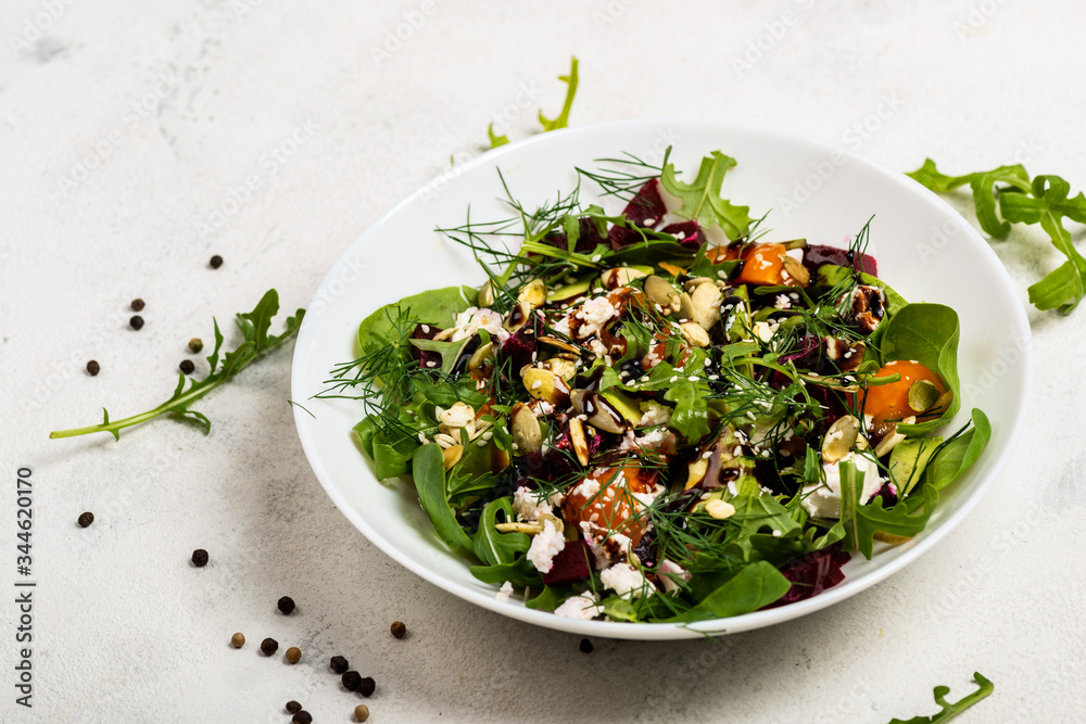 Salad with beetroot, avocado, feta cheese, rucola, tomato, various greens, pumpkin seeds in a white bowl. Diet healthy food for weight loss.