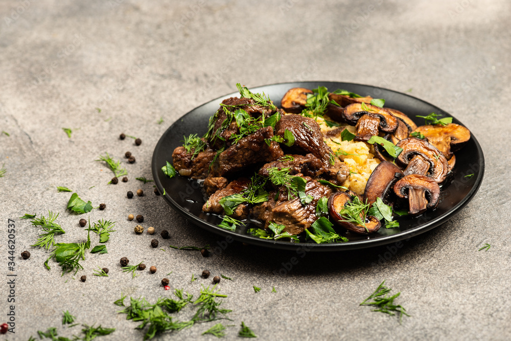 Homemade beef stew with mushrooms and a side dish of lentils on a black plate.