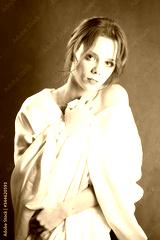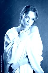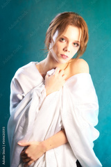 Beautiful girl in a light fabric on aquamarine studio background. Studio portrait of a gentle