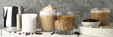 Composition with ice coffee on white wooden background