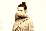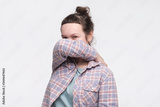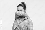 Caucasian woman covers his face with his hands.