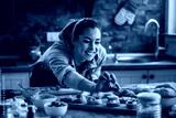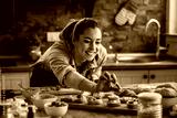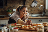 Young happy woman preparing food and making bruschetta in the kitchen.