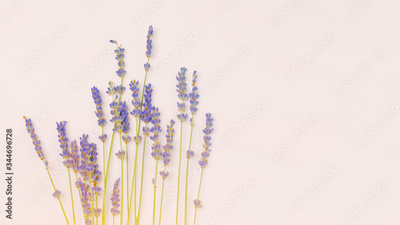 bouquet of violet lilac purple lavender flowers arranged on white table background. Top view, flat lay mock up, copy space. Minimal background concept. Dry flower floral composition isolated on white.