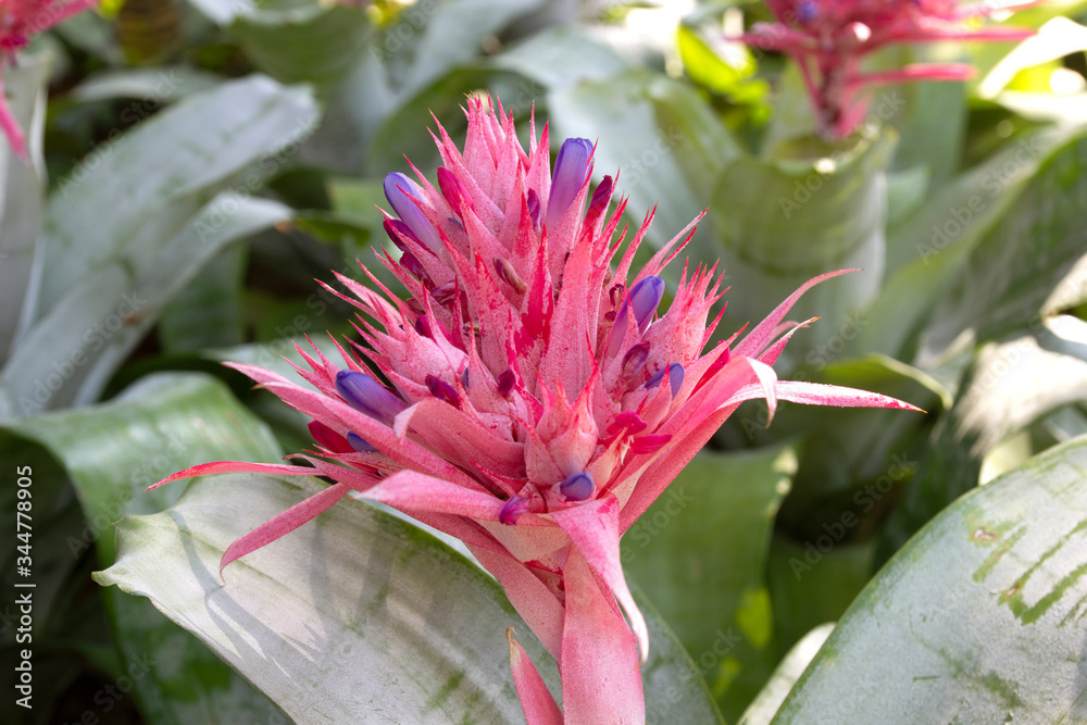 Blooming Aechmea fasciata (Silver vase or Urn plant) is a species of flowering plant in the bromeliad family