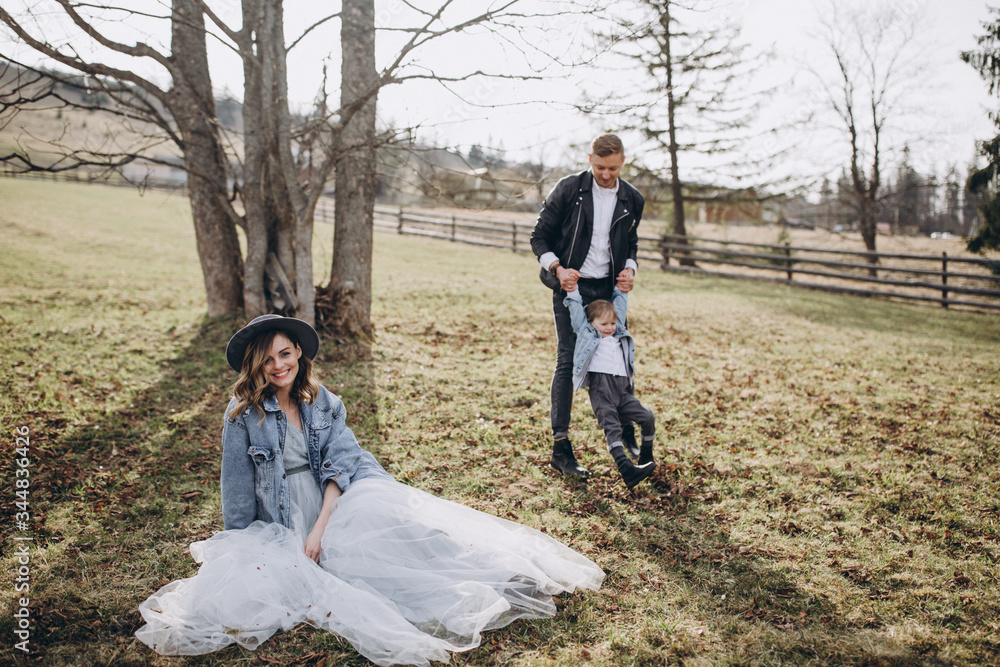 Stylish family in the autumn forest. A guy in a leather jacket and a young girl in a gray-blue dress play with his son in a meadow of a pine forest in the mountains against the background of a fence