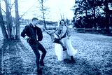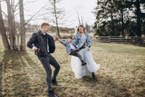 Stylish family in the autumn forest. A guy in a leather jacket and a young girl in a gray-blue dress play with his son in a meadow of a pine forest in the mountains against the background of a fence
