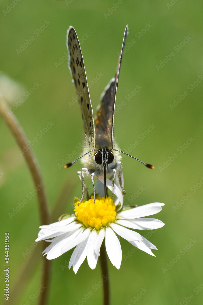 Sooty Copper butterfly on flower. Small blue butterfly, Lycaena tityrus, on meadow