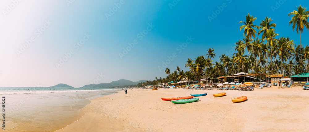 Canacona, Goa, India. Canoe Kayak For Rent Parked On Famous Palolem Beach On Background Tall Palm Tree In Summer Sunny Day