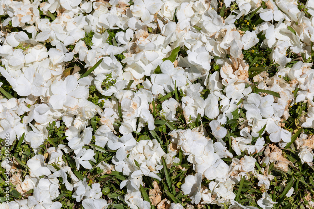 Background of viburnum petals on grass, white and green faded floral backdrop, horizontal aspect