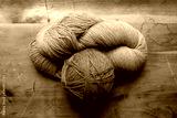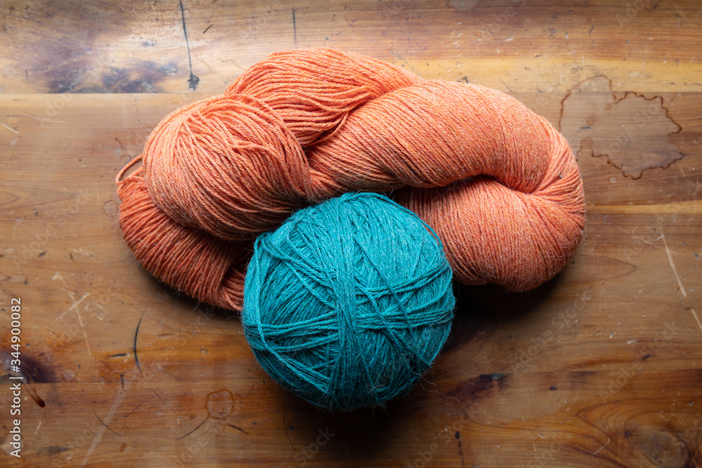 Ball and skein of yarn on old wood background, knitting and crochet backdrop, orange and turquoise, horizontal aspect
