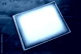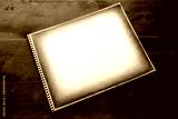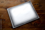 Sketchbook on a dark wood background, white empty page with hand drawn shaded border for your text message, copy space, horizontal aspect