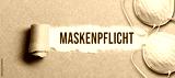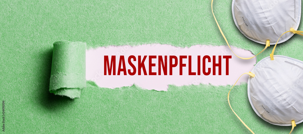torn paper revealing German message for PROTECTIVE MASK OBLIGATION on paper background