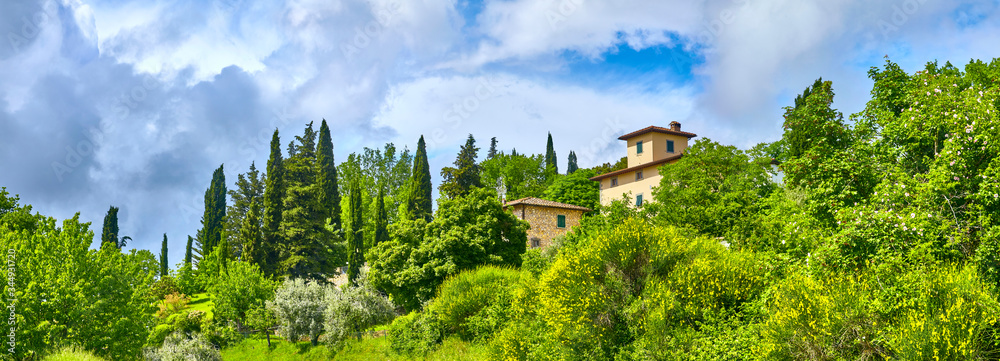 Panoramic view with manor near Reggello, Tuscany, Italy.