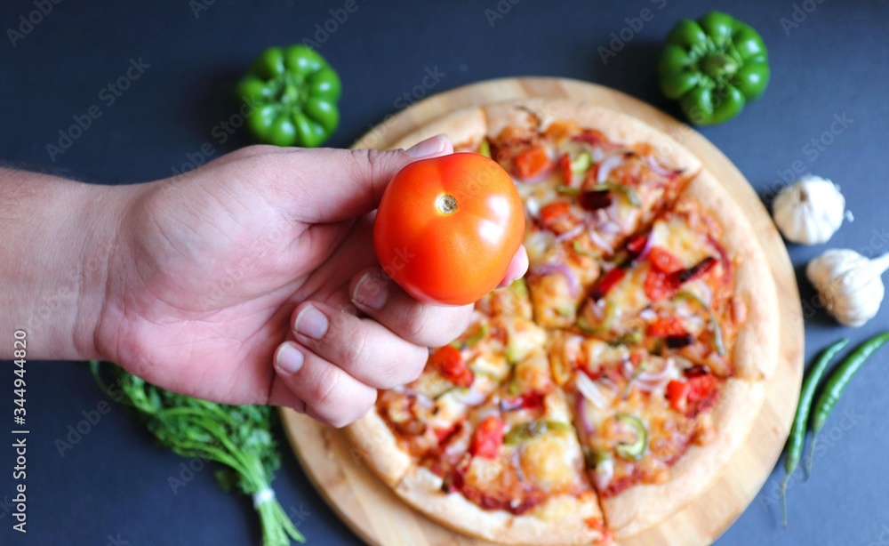 Food- Traditional Italian veggie pizza. Toppings are capsicum, corn, tomatoes, onion, red chilies and cheese. Ingredients and vegetables background with copy space.