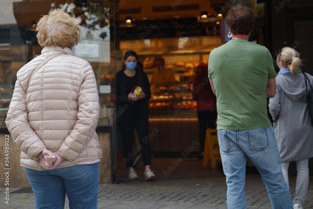 Selected focus view, Group of European people queue and wait for shopping on sidewalk outside store during social distancing and quarantine regulations for COVID-19 virus in Düsseldorf, Germany.