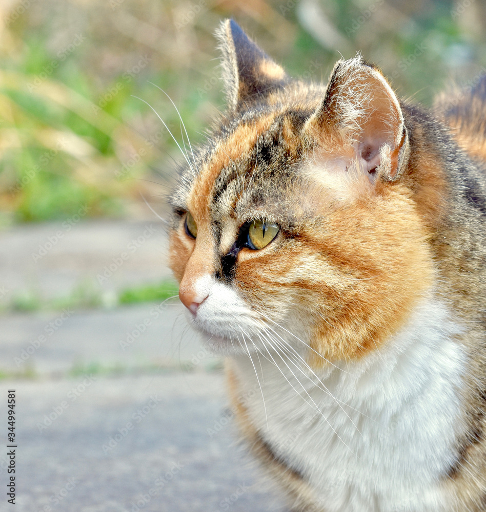 Beautiful orange, black and white cat with a clipped ear. Close up. Profile. Copy space.