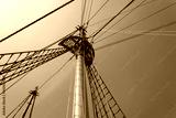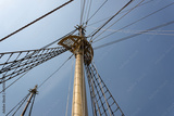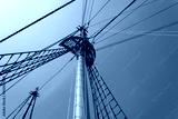 Extreme upward view of a tall ship mast, shrouds and rigging lines radiating out before blue sky, nautical theme, horizontal aspect