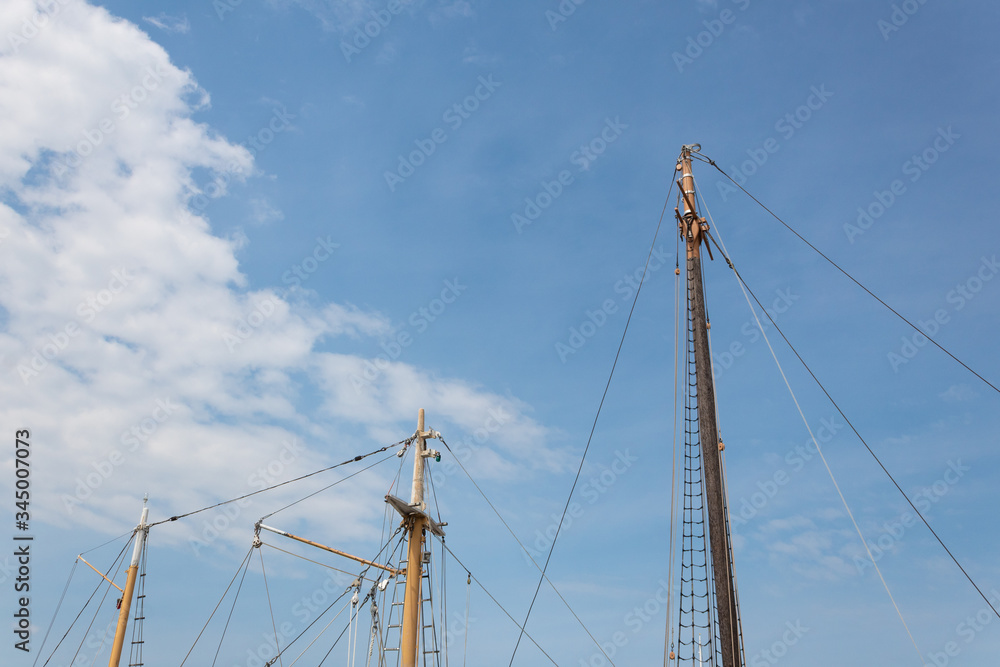 Three masts from two different sailing vessels against a blue sky with clouds, nautical backdrop with copy space, horizontal aspect