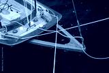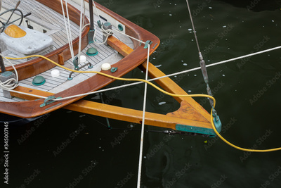 Wood bowsprit and bow of an old sailboat, verdigris copper fittings, mooring lines, horizontal aspect