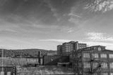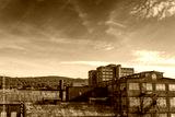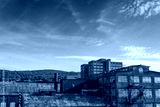 Industrial complex of abandoned and derelict buildings, blue sky copy space overhead, horizontal aspect