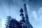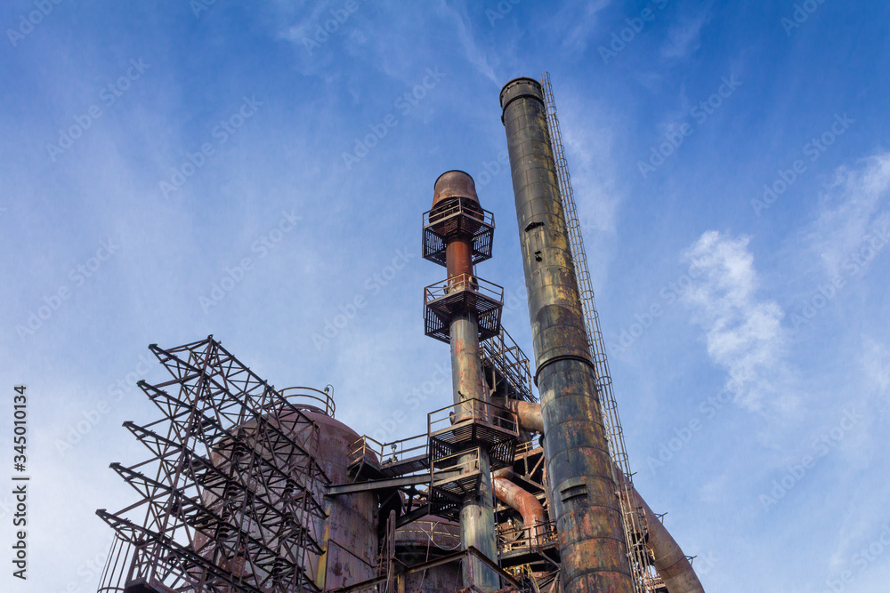 Monumental view from below of huge industrial steel mill complex, abandoned plant facility, blue sky, horizontal aspect