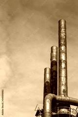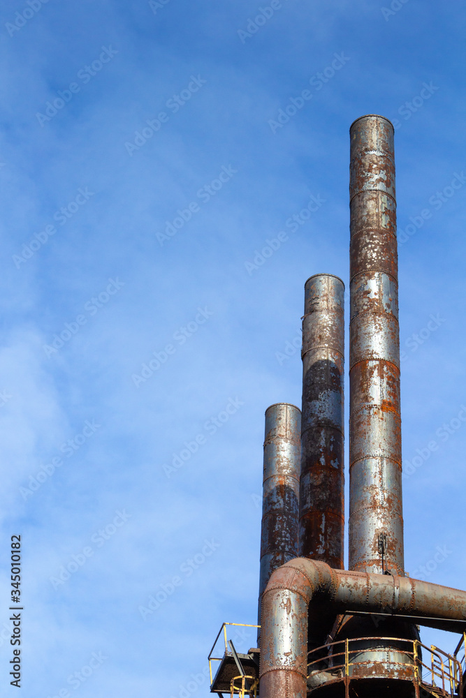 Trio of smoke stacks in an old industrial site, bright blue sky copy space, vertical aspect