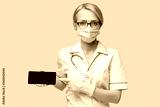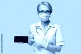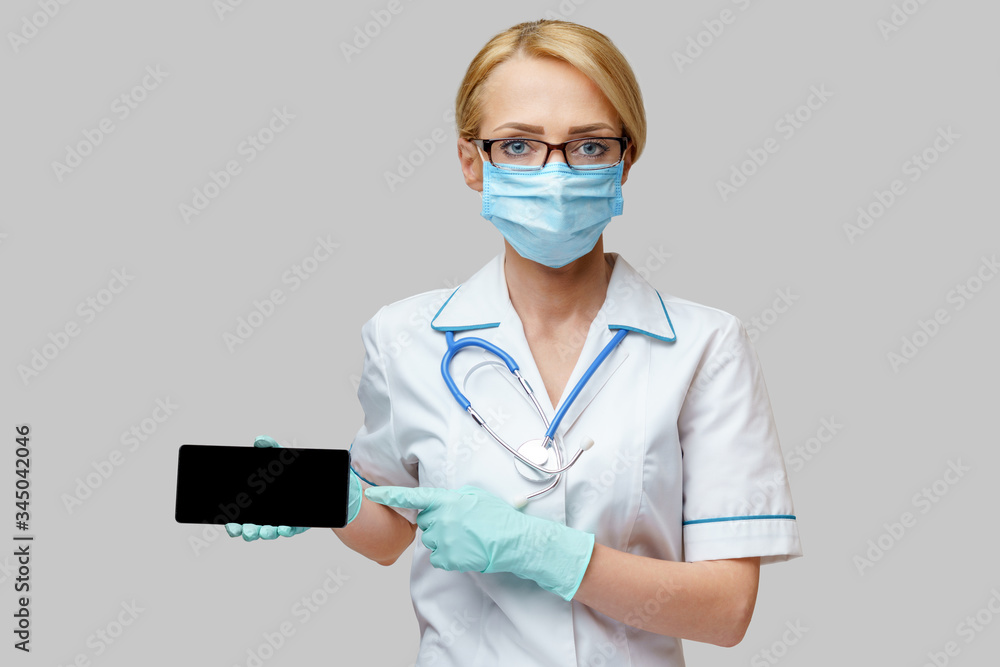 medical doctor nurse woman wearing protective mask and gloves - using mobile phone