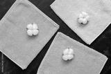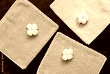 Terry beige towels and cotton flowers on a dark brown rustic background. The concept of natural fabric. Top view, flat lay.