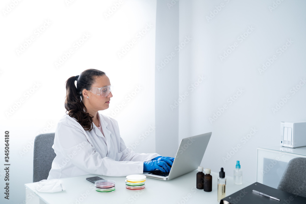 Young Female researcher or scientist in white coat and blue gloves is writing on a laptop in a laboratory. Biochemistry and biotechnology concept.