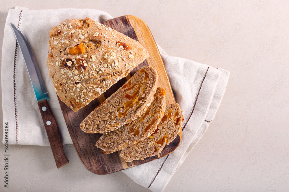 Apricot and oat wholemeal bread, sliced